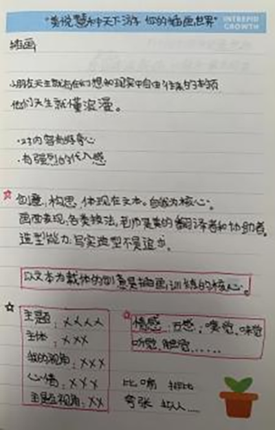 1、参与学校教师内部研讨会(课程研发团队及语文组教师)会上姚建玲书记代表对方向智囊团导师介绍学校的发展规划,明确提出将打造科技与艺术融合特色课程,未来在育才大城北社会美育项目的落地及课程开发上将大有空间。陆江云老师在会上做了《有“画”要说》插画与小学语文课堂专题的介绍,该课程将插画与语文学科紧密联系,核心是用文学和美术双语系统共同培养孩子们的创新力和表达力。丁祎老师以《陶瓷与生活美学》为主题作了课程项目介绍,意在通过将中国传统的茶艺、陶艺、花艺与学生课程相融合,提高学生的审美能力,培养其积极健康的审美趣味,根植新时代文化自信,在中华优秀传统文化中陶冶心灵,健全人格。
