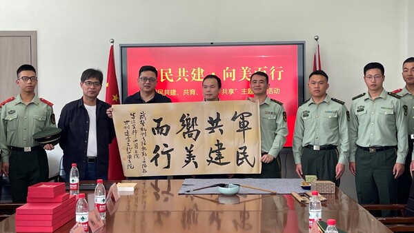 随后,郭建党老师代表我院为此次活动题写了“军民共建,向美而行”的书法作品赠予大队官兵。在支部党员的陪同下,武警官兵还参观了中国美术学院象山校区、中国国际设计博物馆,深刻感受到了中国美院校园环境的独特魅力以及相关文化艺术创新工作成果。双方对此次共建活动的意义与成果表示了充分肯定。