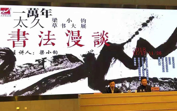 由中国美术学院继续教育学院、浙江省青年书法家协会、临沂市文化广电新闻出版局主办,临沂大学美术学院、临沂市书法家协会、临沂市美术馆承办,山东美澳置业有限公司、临沂中楷信投资开发有限公司、浙江台谊消防设备有限公司、杭州登煌安全技术有限公司、临沂沂州府实业有限责任公司、临沂创联建设有限公司协办的“一万年太久』梁小钧草书大展于2018年11月17日在临沂市美术馆隆重开幕。