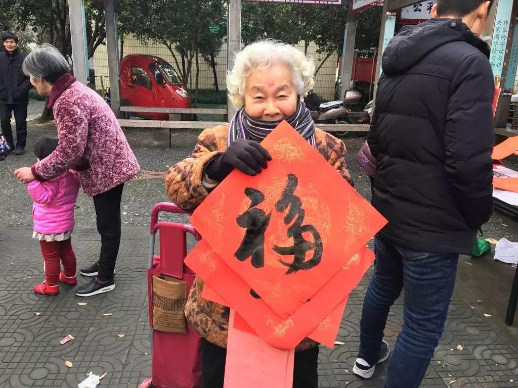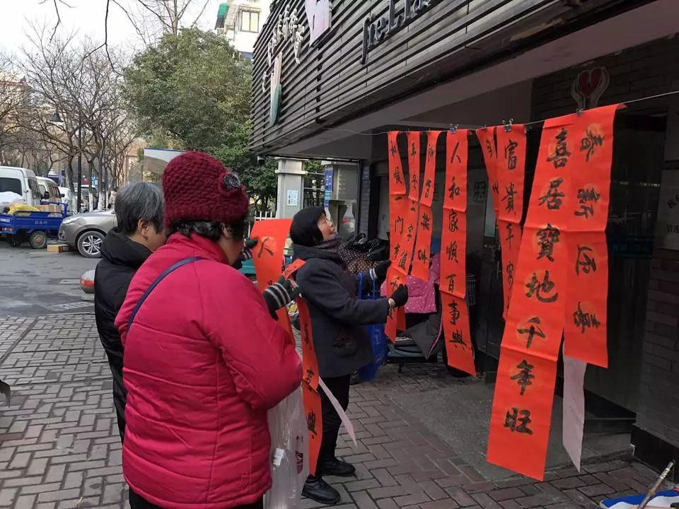 活动现场热闹非凡,寒冷的天气也阻挡不了大家的热情。志愿者们饱含创作热情,挥毫泼墨,写福字,送春联,忙得不亦乐乎。社区居民们则接过一对对刚刚写好的春联福字,有的忙着晾晒墨迹,有的细细品读,对书法老师的作品称赞连连。