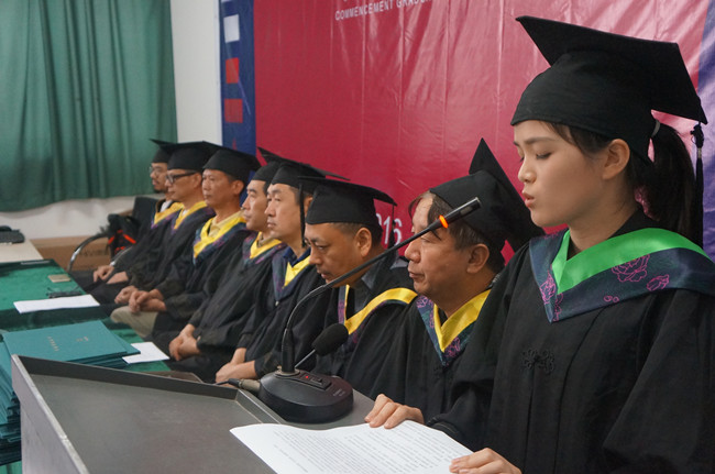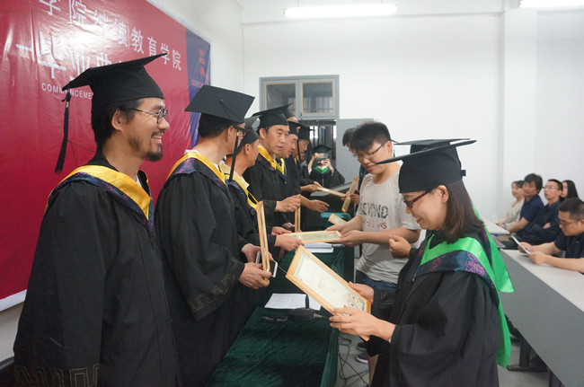 毕业典礼在庄严的国歌声中拉开帷幕,安滨院长代表继续教育学院致词: 安院长首先祝贺毕业生们在这个夏季收获了成果,圆满完成学业,获得学士学位。今年中国美术学院继续教育学院2016届毕业生于6月顺利毕业,毕业生总人数125人。获得学士学位96人。其中优秀毕业生9人,优秀毕业创作23件。今年继续教育学院本科毕业生获得学位人数比往年有所提高,这是学院教学质量提升,学生勤奋努力的成果。同学们经过几年的专业研究与学习圆满地完成了学业,成为中国美术学院的合格毕业生。希望即将离开校园的毕业生们能够始终保持学术激情和问学的踏实作风,在今后的事业中发挥自身潜能和个人优势,走出你们的精彩人生,实现自己的梦想,要感激成就你们这一切的老师、同学,亲人、学校。在以后的的生活和工作中望毕业生们学会担当,要有一个正面人生态度,在自己的事业求索中,要有耐心和毅力,持之以恒。为社会的发展贡献自己的才华与智慧。最后祝愿所有的毕业生展翅高飞,鹏程万里!