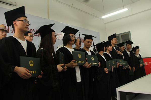 随后,在激昂的音乐声中,黄学和书记宣布了今年被授予学士学位、优秀毕业生、优秀作品的名单,主席台上各领导为学生颁授证书,并与其合影留念。