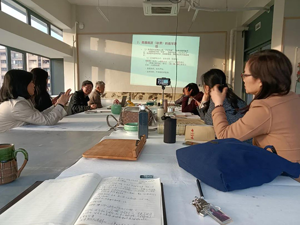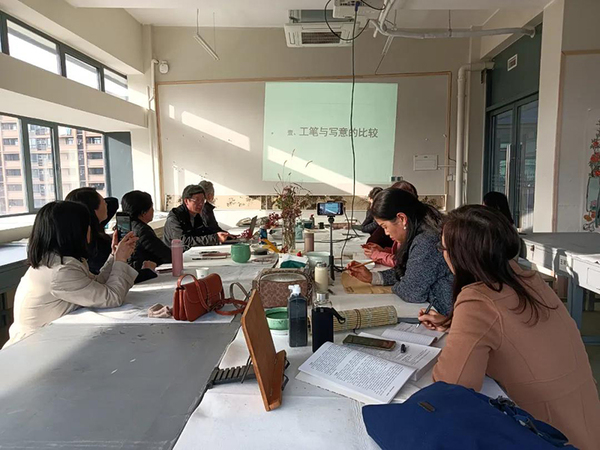 接着班主任张东华老师为学员们作了题为“工笔与写意的比较及青藤画派的起源”讲座。张老师通过图文并茂的形式,对徐渭写意画风的起源和传承作了追本溯源的阐释,并对青藤画派的画学思想、笔墨风格、传承传播作有理有据的分析,指出青藤画派以阳明学“致良知”为理论依据,呈现在徐渭的绘画理论中则表现为“出乎己不由于人”的绘画理念,在绘画中表现为顿悟状态下的“急就”。强调诗、书、画的结合,不求形似求生韵,直抒胸臆,用笔墨真率表达性情。