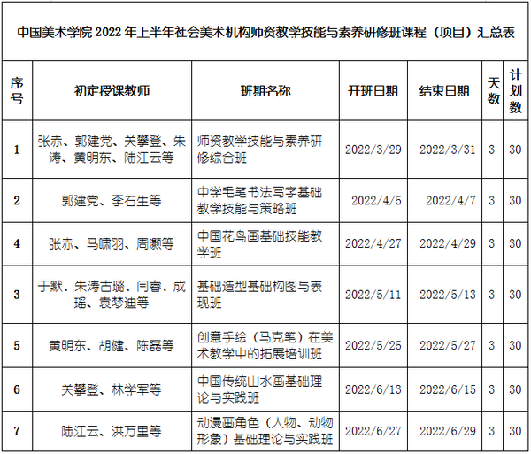 2020年中共中央办公厅、国务院办公厅印发《关于全面加强和改进新时代学校美育工作的意见》并发出通知,要求各地区各部门结合实际认真贯彻落实。美育教师作为传承创新中华优秀传统文化的重要传播者,从美育工作现状来看,当前需要迫切解决的是师资队伍建设问题,美育师资在数量上还有相当大的缺口,在质量上更需要加强提高。以《意见》精神为指导,深刻认识美育的重要性紧迫性,我院将在师资美育教学中不断创新培养模式,逐步完善高校与社会文艺团体协同育人机制,培训围绕“艺术基础知识基本技能+艺术审美体验+艺术专项特长”的教学模式,不断提高美育师资队伍的整体素质。中国美术学院继续教育学院以此为契机,践行“美美与共”的社会美育传播理念,培养具有较高专业素养的专业机构教师。由中国美术学院主办,中国美术学院继续教育学院承办的社会美术机构师资教学技能与素养研修班开始面向全国招生。该班特精心整合学校资源,充分利用中国美院专业教育优势,教学团队依托国内名家,通过讲座、理论教学、教学实践、教学观摩来提升具有较高审美能力、技能及专项特长的机构教师人才 ,各位学员可根据自身需求选择以下课程。中国美术学院2022年上半年社会美术机构师资教学技能与素养研修班课程(项目)汇总表如下: