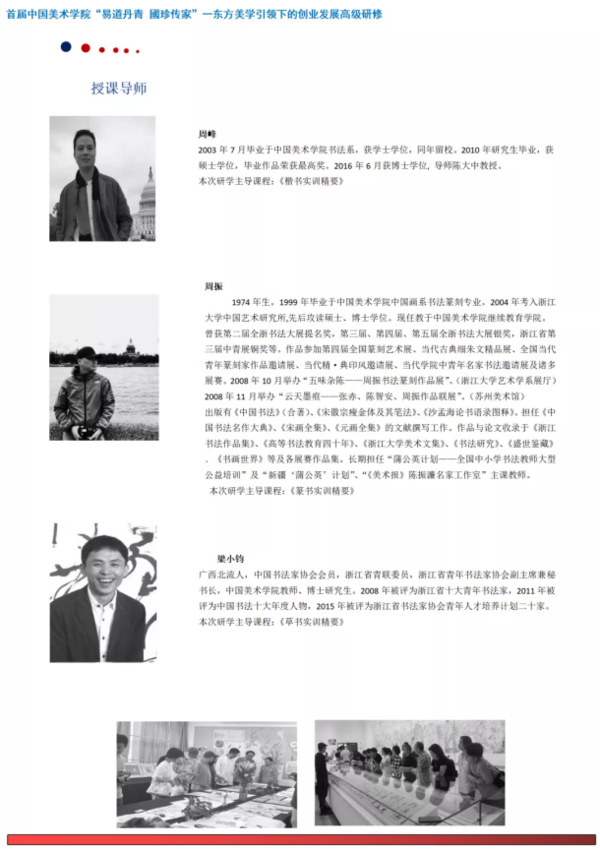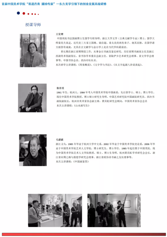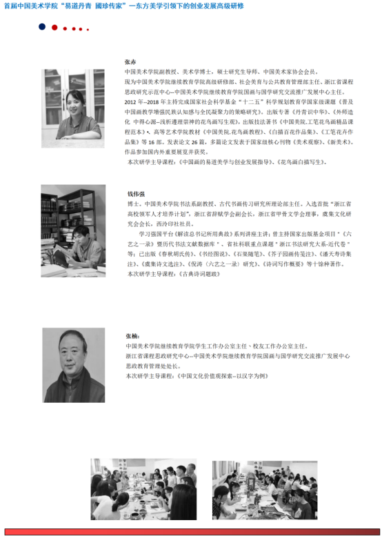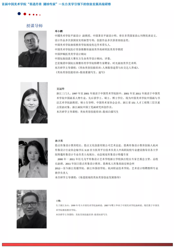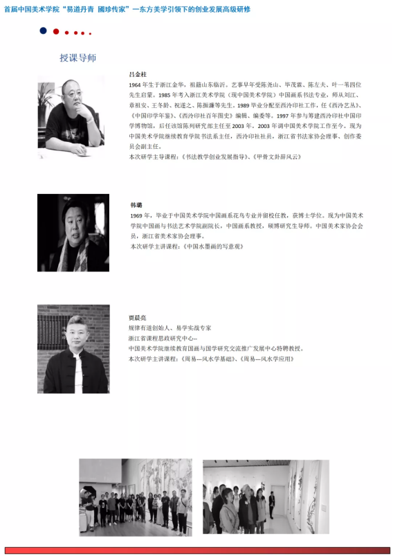 为建设具有美丽人心、美善风尚、美好生活的美丽中国,打造以弘扬中华优秀传统文化为立基的东方美学引领下的创业发展教育的全国高地,从而以美的形式,将社会主义核心价值观融入百姓的日常生活,建勋当今腾飞的伟大时代。由中国美术学院继续教育学院承办的首届中国美术学院“易道丹青國珍传家”——东方美学引领下的创业发展高级研修班,集结专家、教授精英教学团队,以《易经》中的《周易》为本届研修的手筋,带领学员深入认识一门以社会人生开拓发展,应用于当今时代的实用“易学”,使学员获得美育立德,惠利社会的生命智慧与创造规律,由此进入以“易学”为立基的东方美学思想引领的中国书画,以及美容美妆研习与创业发展的开拓之路,从而迈向幸福精彩人生,开拓新时代的康庄大道!