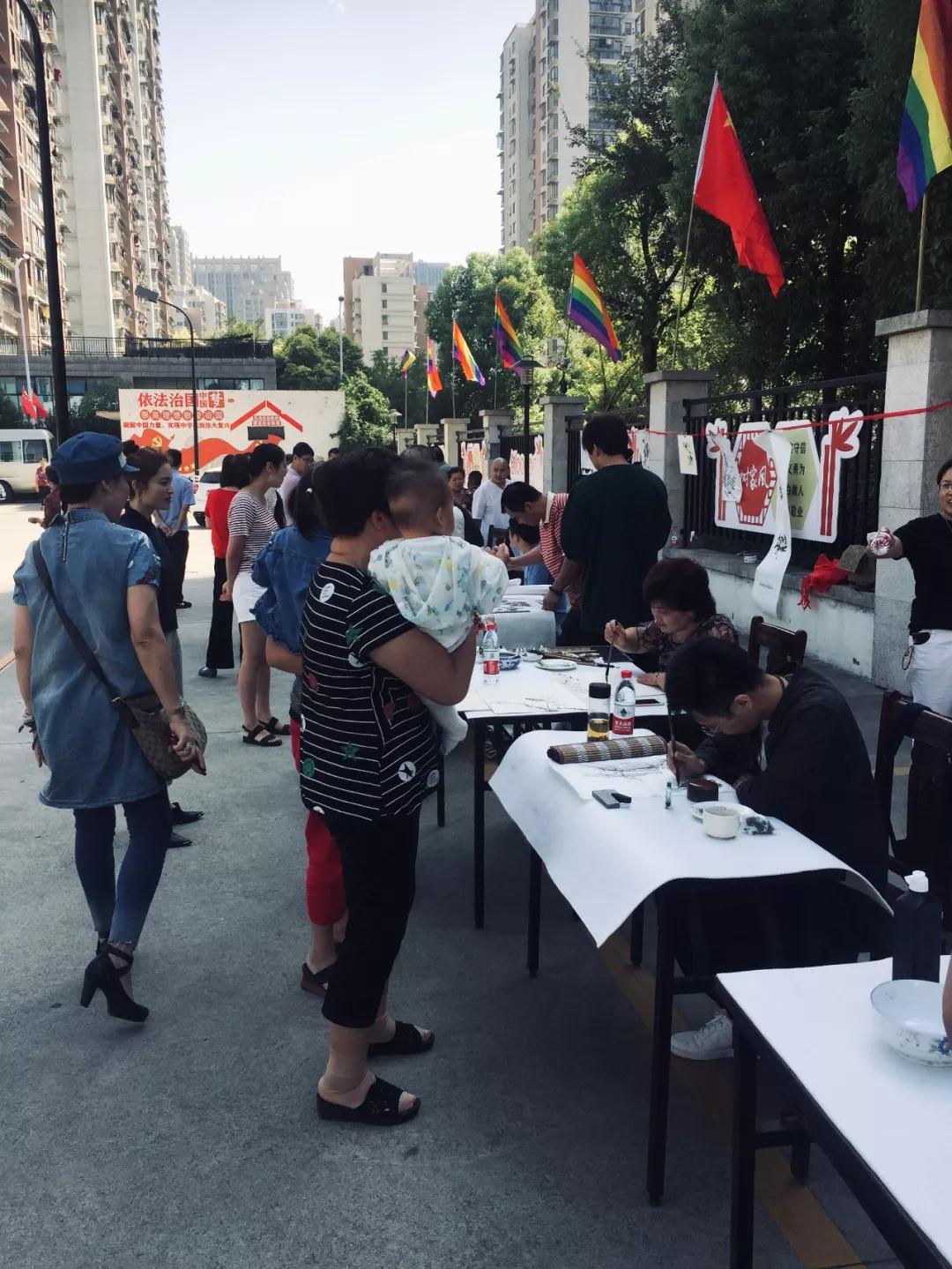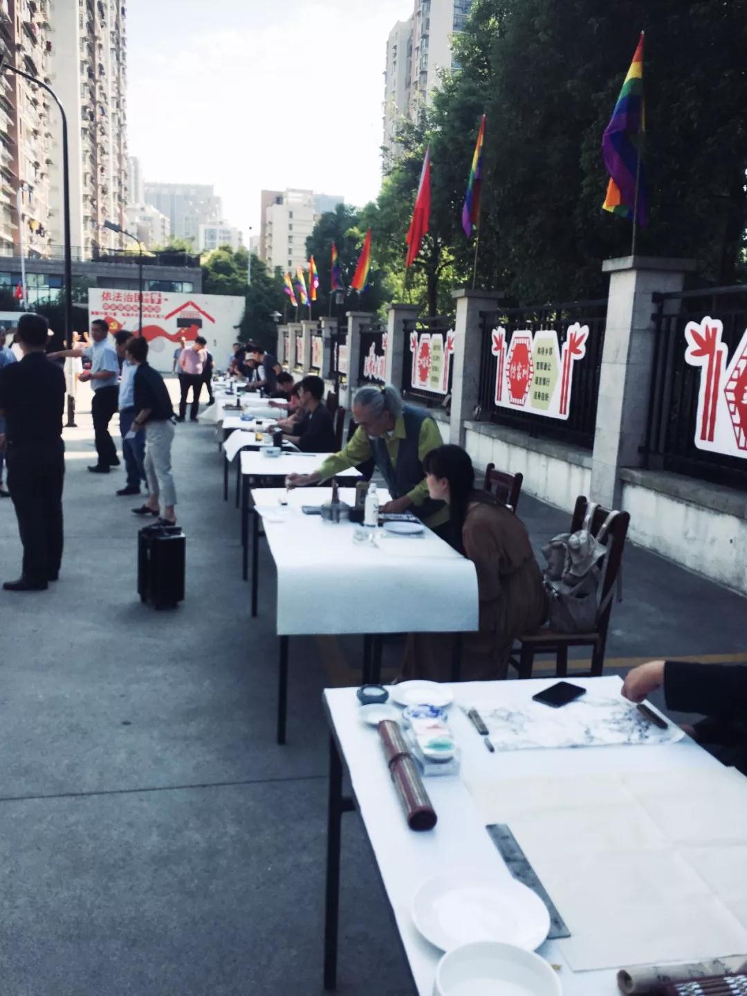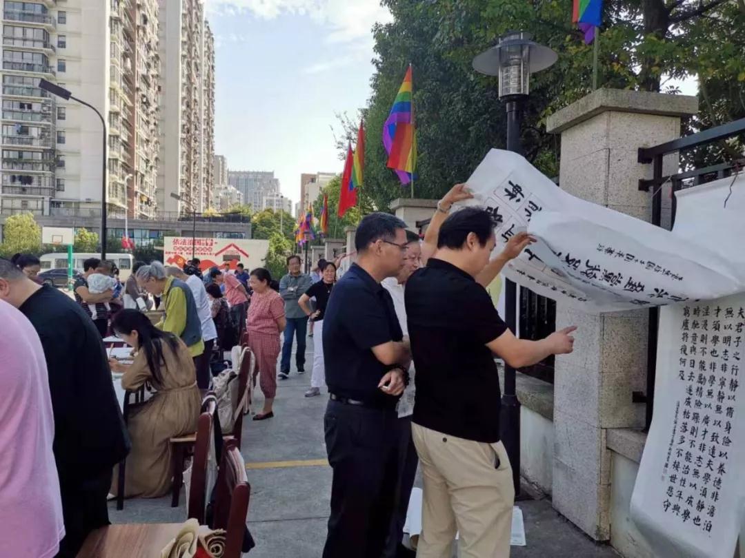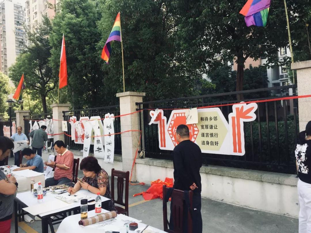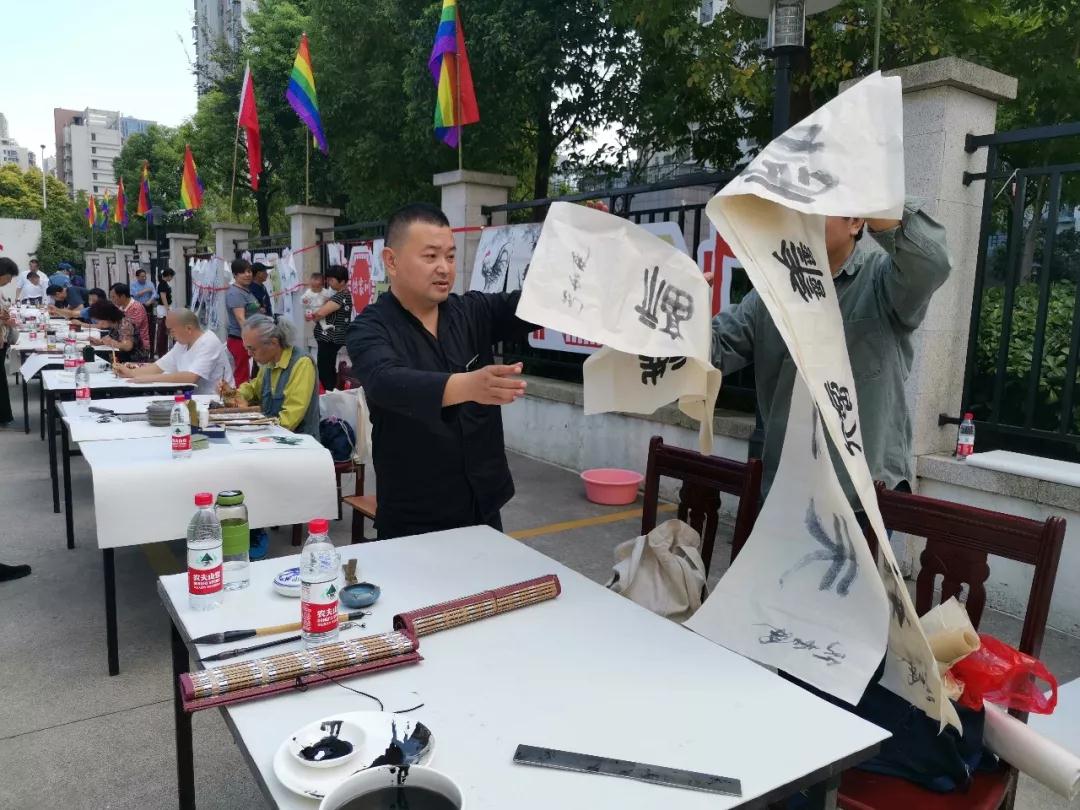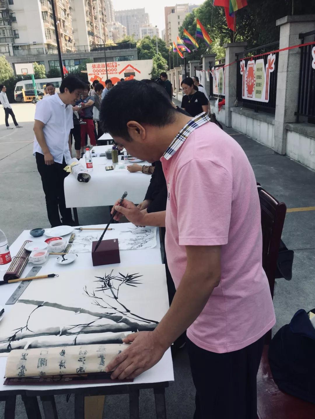 在活动现场,中国美术学院继续教育学院组织了学生代表15人,在当场挥毫泼墨,题材涉及山水、花鸟、书法等多项艺术表达形式。以书法寄情怀,以笔墨书心声,他们挥毫泼墨在现场尽显各自面貌,一幅幅刚劲有力的书画作品展示了对美好生活的歌颂。每一幅作品都渗透着同学们对祖国的真诚和热爱,充分展示了同学们们用艺术讴歌新时代的激情。他们用激昂的笔墨庆祝新中国成立70周年。现场上社区群众和同学们一同将书画作品高高挂起,一幅幅精巧的作品陈列展示出来,同学们和社区群众一同欣赏,一起交流,取得了良好的互动效果。