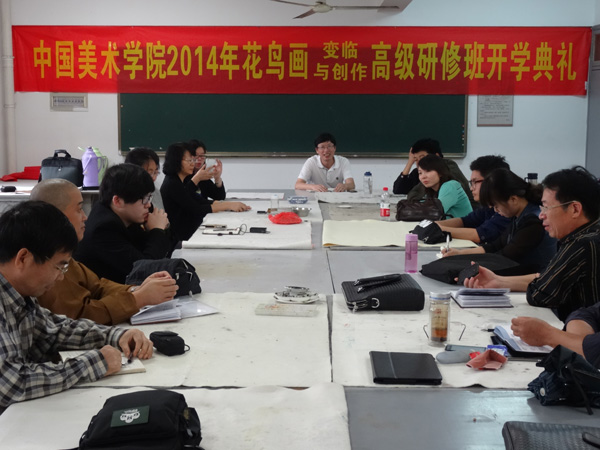 9月19日下午3点, 中国美术学院2014年花鸟画变临与创作高级研修班在中国美院继续教育学院举行了开学典礼。出席开学典礼的有中国美院继教院书记黄学和、副院长朱卫东、项目主持人兼班主任张东华老师和二十多位来自全国各地的花鸟画爱好者、画家、研究生、大专院校和中小学老师。