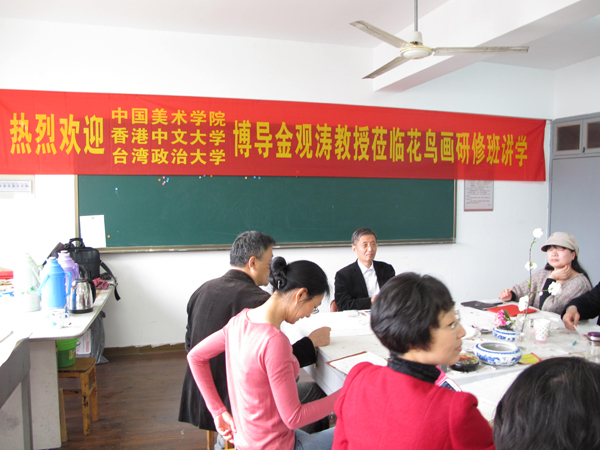 金先生近年来在大陆、香港、台湾两岸三地讲学,特别忙。这次讲座因他是研修班班主任张东华的导师,在张老师的力邀下,在中国美院讲学的间歇被邀请来班上作讲座的。他从张老师的博士论文《格致与花鸟画》讲起,认为自1905年废科举以来作为中国文化两千年来认识自然的方法“格致”就失去了正当性,它被科学取代了。但在一个领域中一直顽强地存在着,这就是中国传统绘画。中国美术学院是中国画的大本营,不少教授是中国绘画精神的传承者,他们早就知晓必须在国画笔墨中寻找天理。在技法方面的典型表现就是临摹,这是儒学“述而不作”在中国传统绘画中的表现,到中国美院学画就是学习传统。金老师从思想史的角度告诫我们学习中国传统绘画要从传统入手,不能急功近利。最后,他还回答了我们学员提出的一些问题,令人意外的是当有学员问到《芥子园画谱》为什么会成为流行的学画范本时,他说他不知道。同时,他又说学术这东西,知道就是知道,不知就是不知,不能不懂装懂。