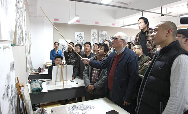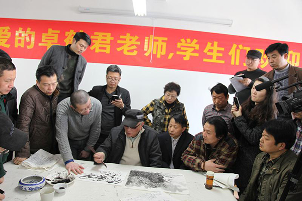 (1)卓老师为我们作了两次深入的、精准的树石法点评和一次具有学术高度的艺术谈话, 卓老几十年山水画艺术的经学之路给学员们的启发是多方面的,尤其是他常用的一句经典画语:要敢于“画坏画”,更是言简意赅,意义丰厚。让同学们特别感到温馨的是卓老的谦和与细心,在点评作业时,卓老总是笑盈盈地指正缺点提出希望。更令人感佩的是卓老还亲自动笔,针对性地为每位同学的作业作了详细的笔墨示范和修正,导师对于学员的厚爱以及对于学术的敬业精神令人印象深刻。