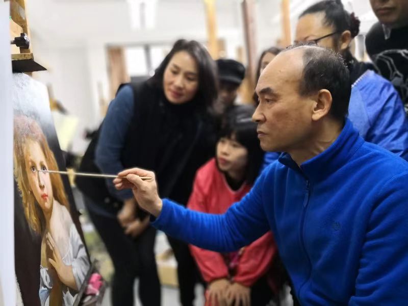 许江院长在巴巴画展现场给学员们讲授油画技法2