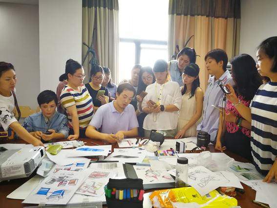 胡健老师通过设计素描的教学,明确了设计素描教学侧重与以明确、生动、富有表现力的线准确塑造描绘的对象。准确地塑造对象,以线性描绘对象,通过对形体外部结构观察与分析,理解物象内部结构、体积及相互关系。这对创意手绘产品打下了坚实的基础。黄明东老师再通过对形(体)的创造与表现训练,使老师们在组织、运用形体能力、丰富视觉化语言想象力和创造力都得到了相应的提高。最后通过马克笔、色粉笔、彩铅等工具手绘表现产品效果图、实地参观考察等教学模块扎实地提升了教师的创意产品的手绘技能以及设计创新意识。